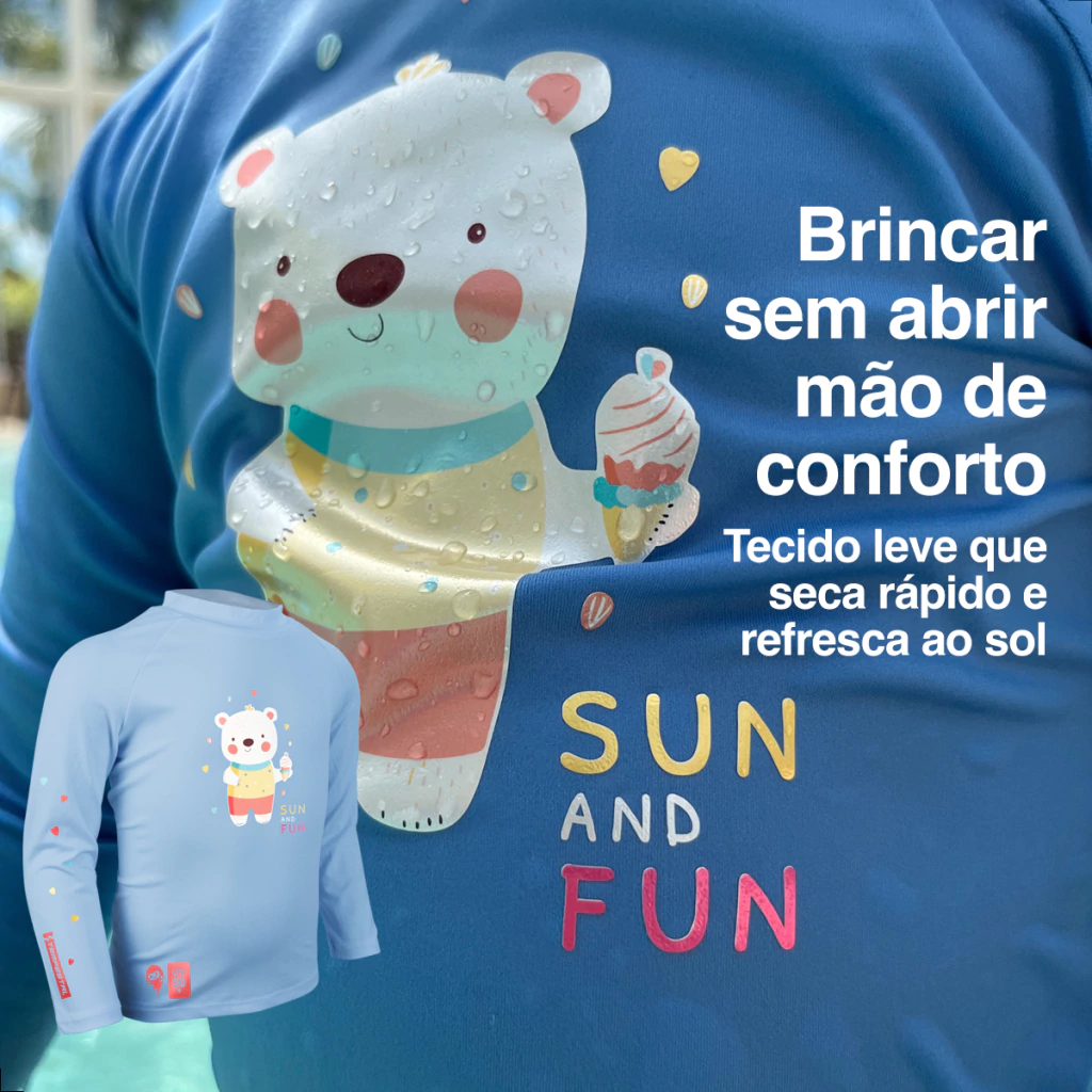 A Camisa Tempestinhas protegem crianças e bebês dos raios UV pois cobrem braços, tronco e pescoço.