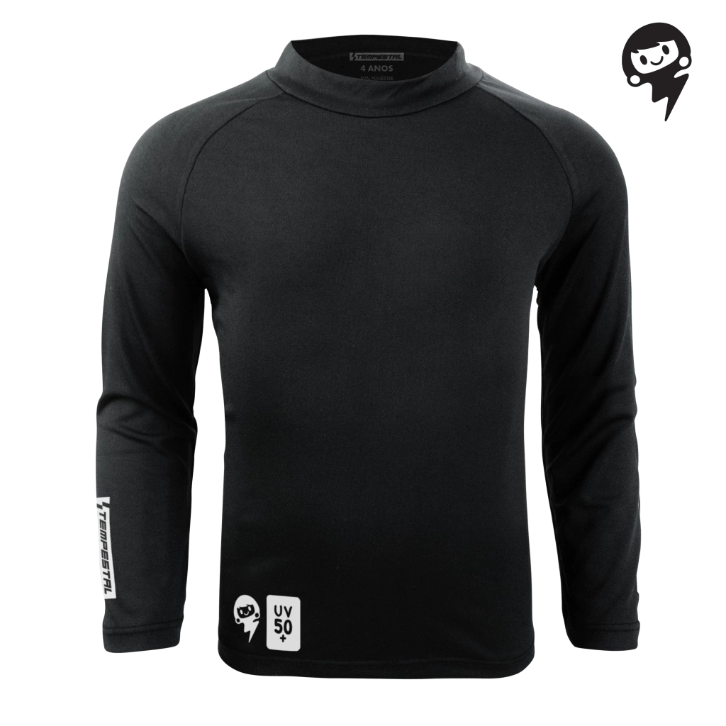 A Camisa Tempestinhas protegem crianças e bebês dos raios UV pois cobrem braços, tronco e pescoço.