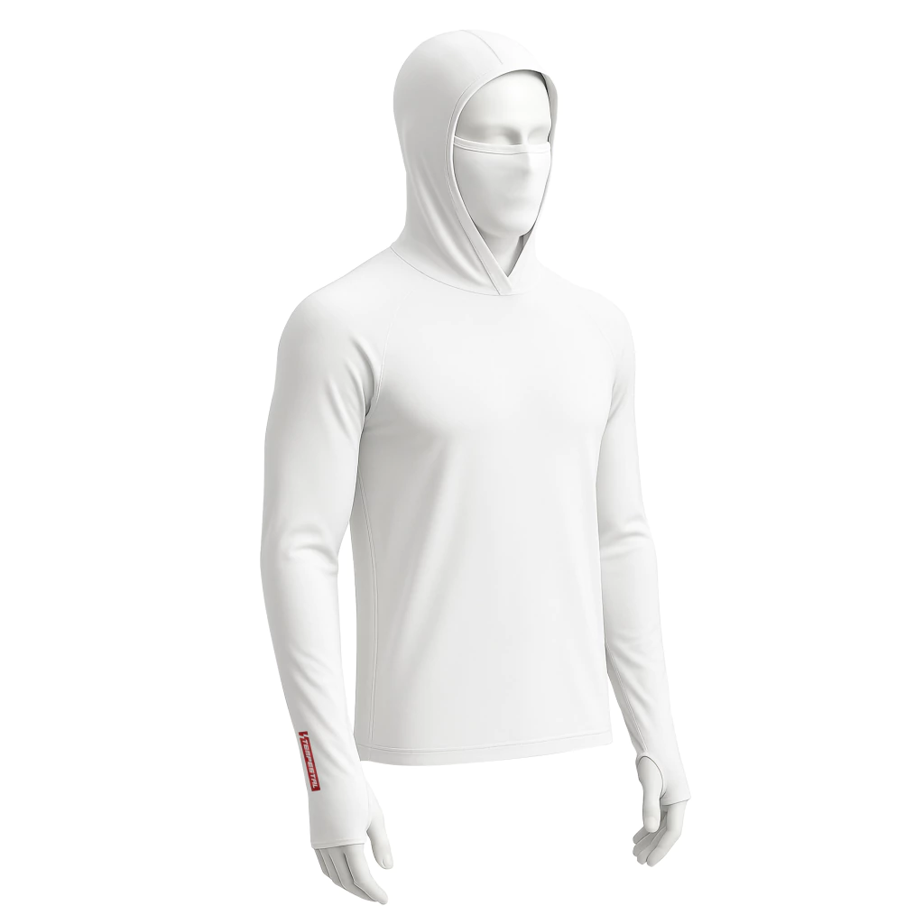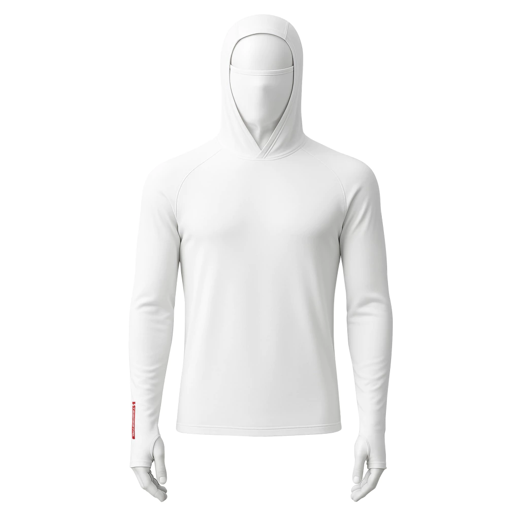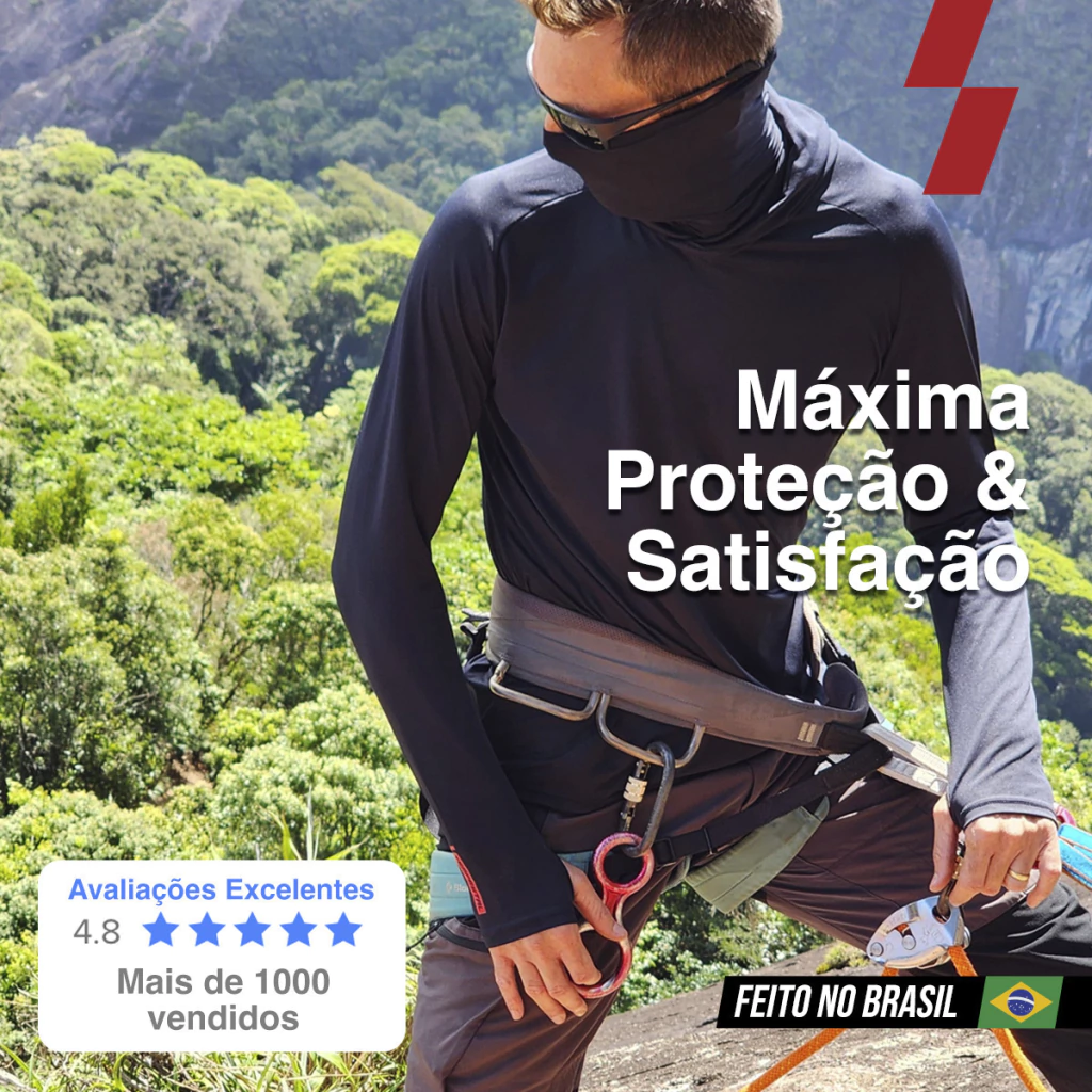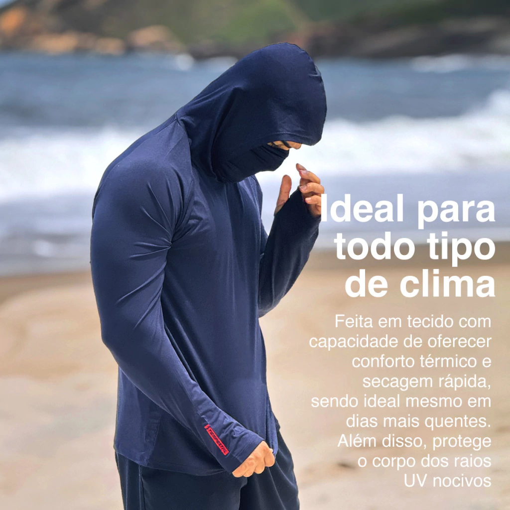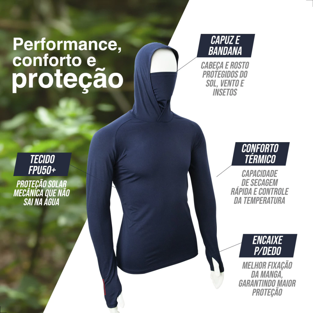 Ideal para proteger áreas que normalmente ficam expostas ao sol, possui capuz e bandana para cobrir cabeça e face, além de contar com manga com encaixe para dedo, protegendo as mãos.